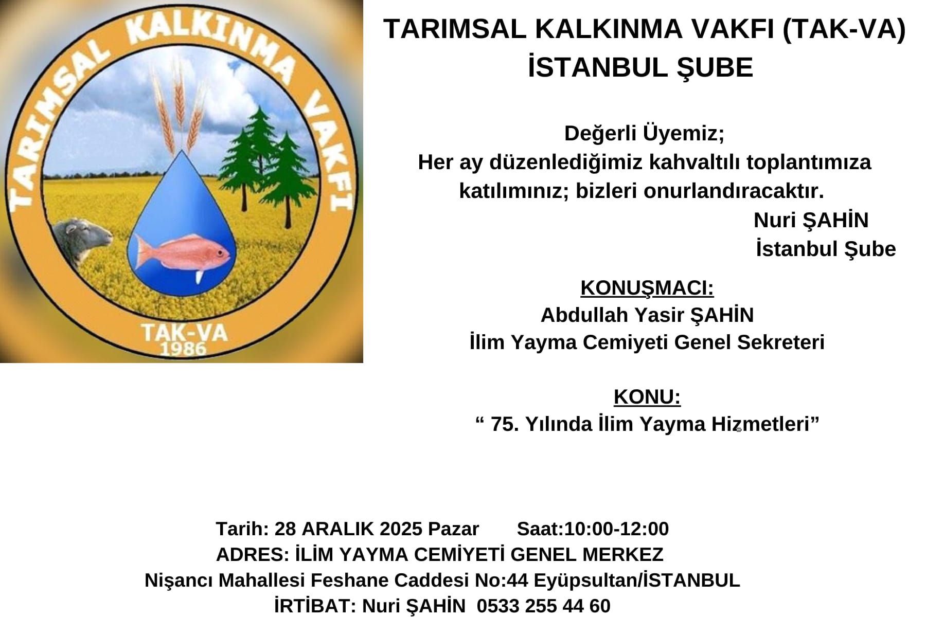 Tarımsal Kalkınma Vakfı (TAK-VA) İstanbul Şube olarak 28.12.2025 Pazar günü Saat:10.00’da Eyüpsultan’da bulunan İlim Yayma Cemiyeti Genel Merkezi’nde bir araya gelindi.